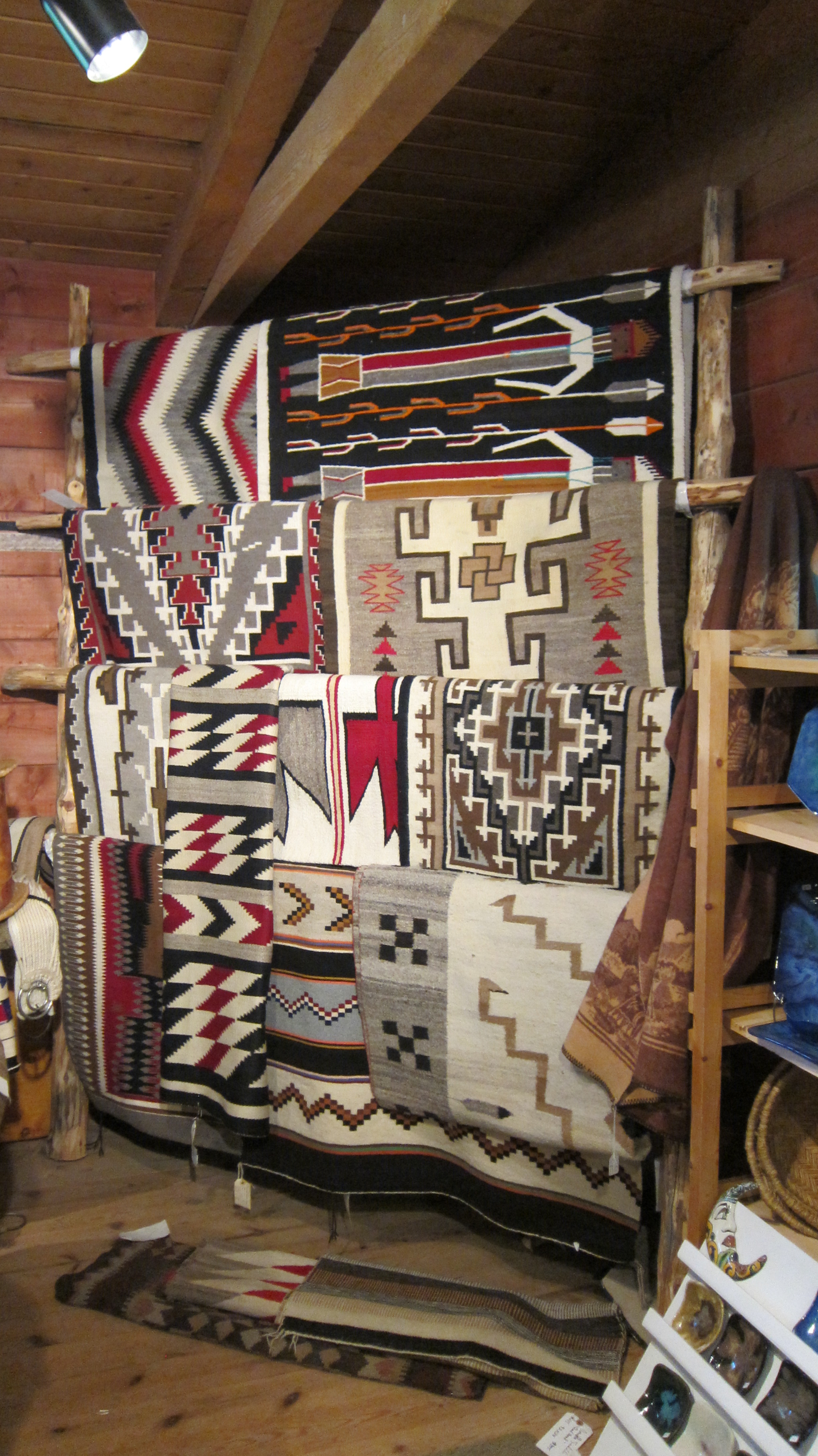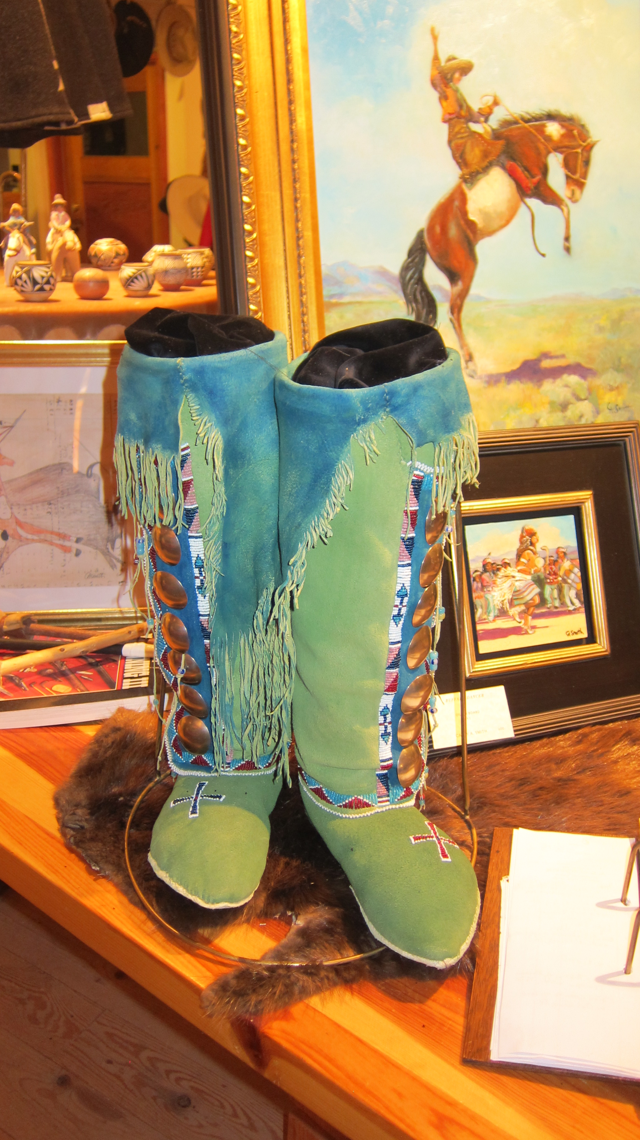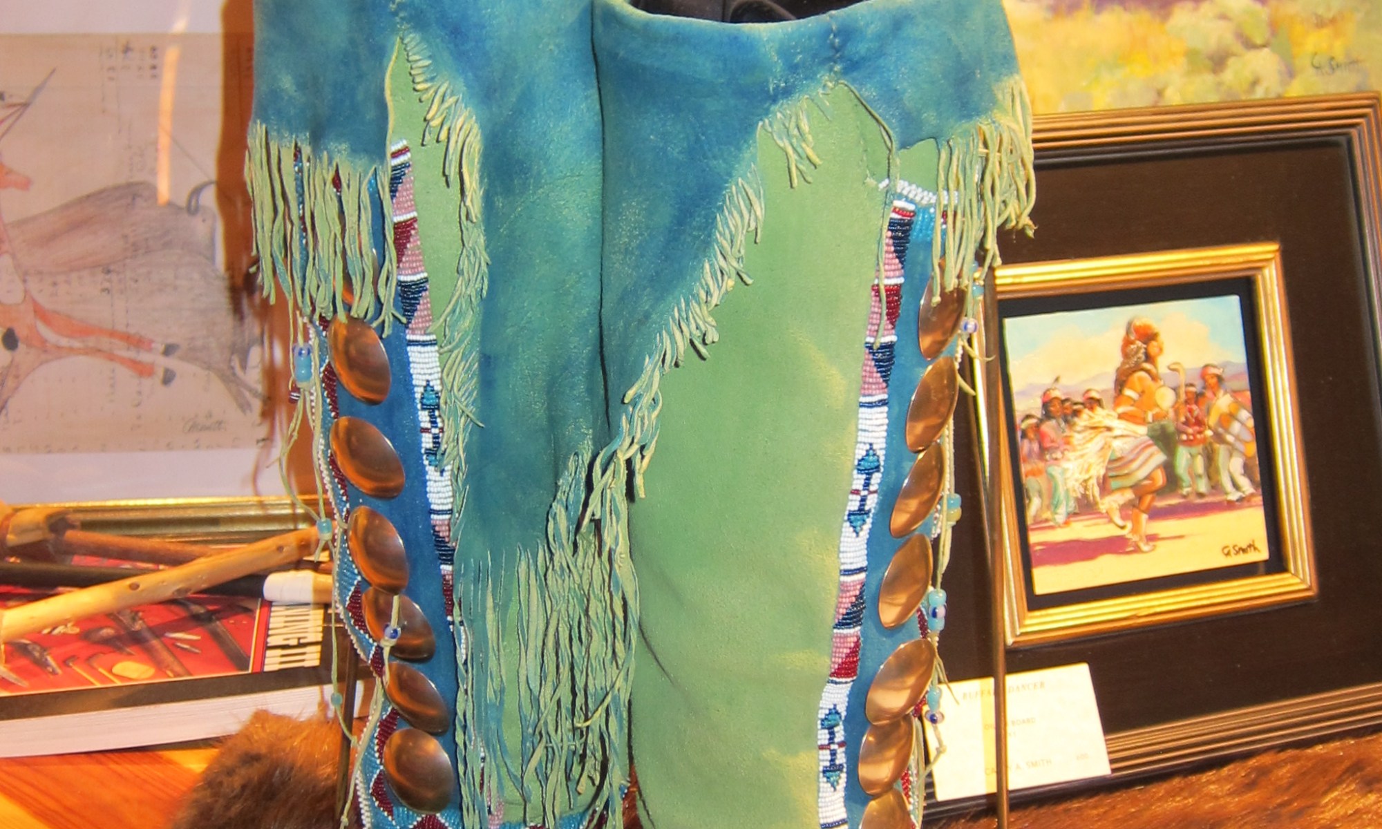 My travels included a stop at the historic Nambe Trading Post off Route 503. It’s one of the last authentic trading posts in the area. There I met Jennifer Jesse Smith, one of the owners of the shop and a local artist. What a wonderful experience that turned out to be. Jennifer took the time to show me around the trading post and provided a commentary about the wonderful collection she has at the Trading Post, including numerous authentic native artifacts and an array of fabulous pieces of local art, such as handcrafted jewelry, locally woven native blankets, pottery, paintings and more. Included in the collection were a number of native costumes made by her mother, Cathy A. Smith, the Emmy award winning designer, made for the movie Dances with Wolves which starred Kevin Costner. If you are in New Mexico, stopping in at the Nambe Trading Post is a must! Here are a few photos of what you might find there.