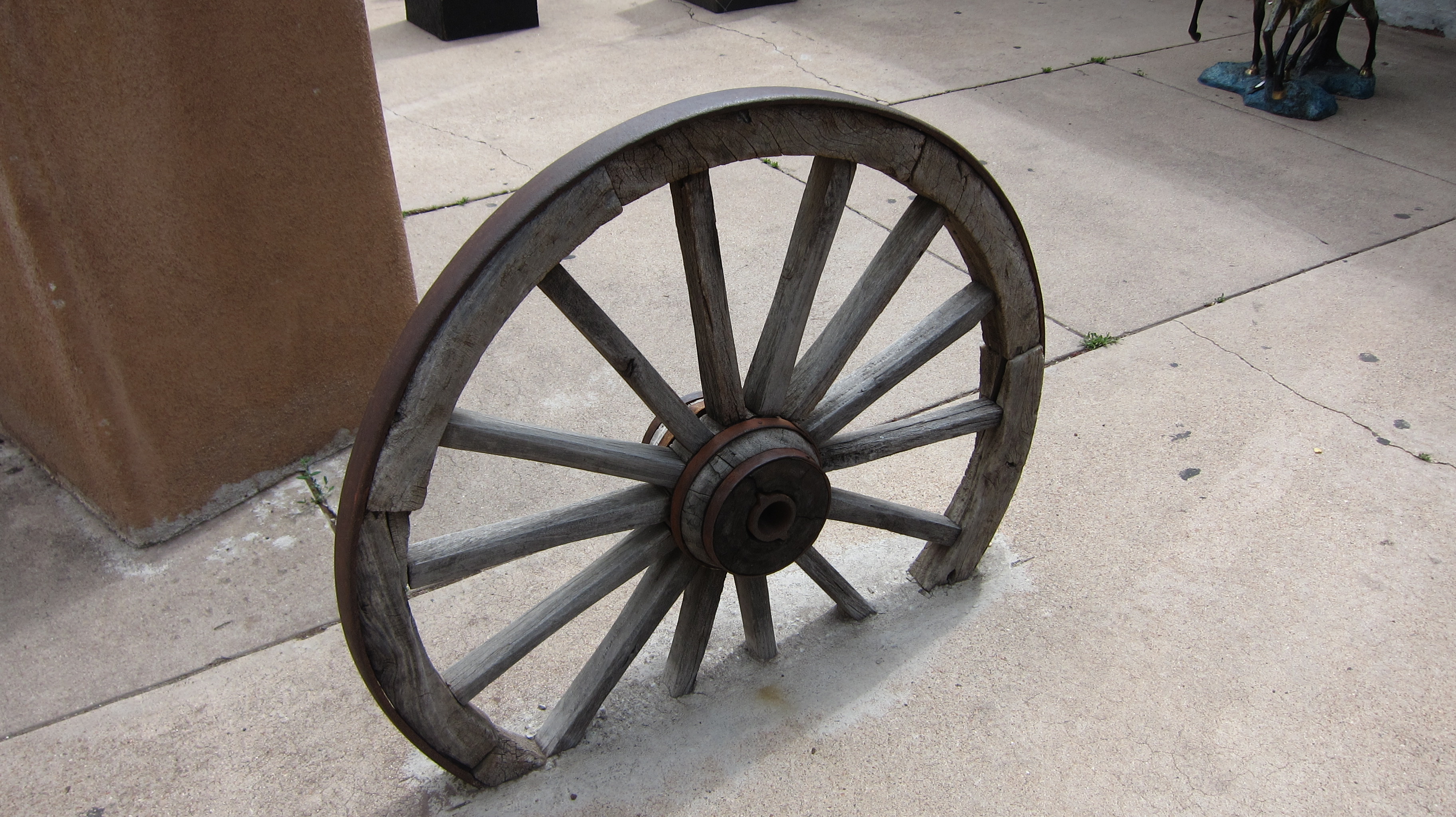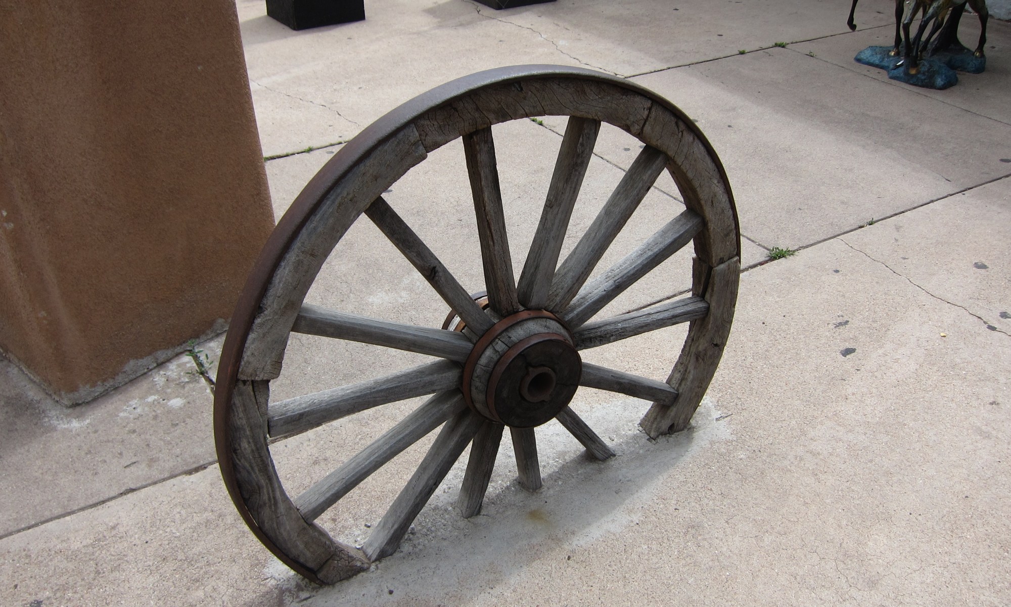 A fence crafted from small branchesHistoric wagon outside of the Nambe Trading Post