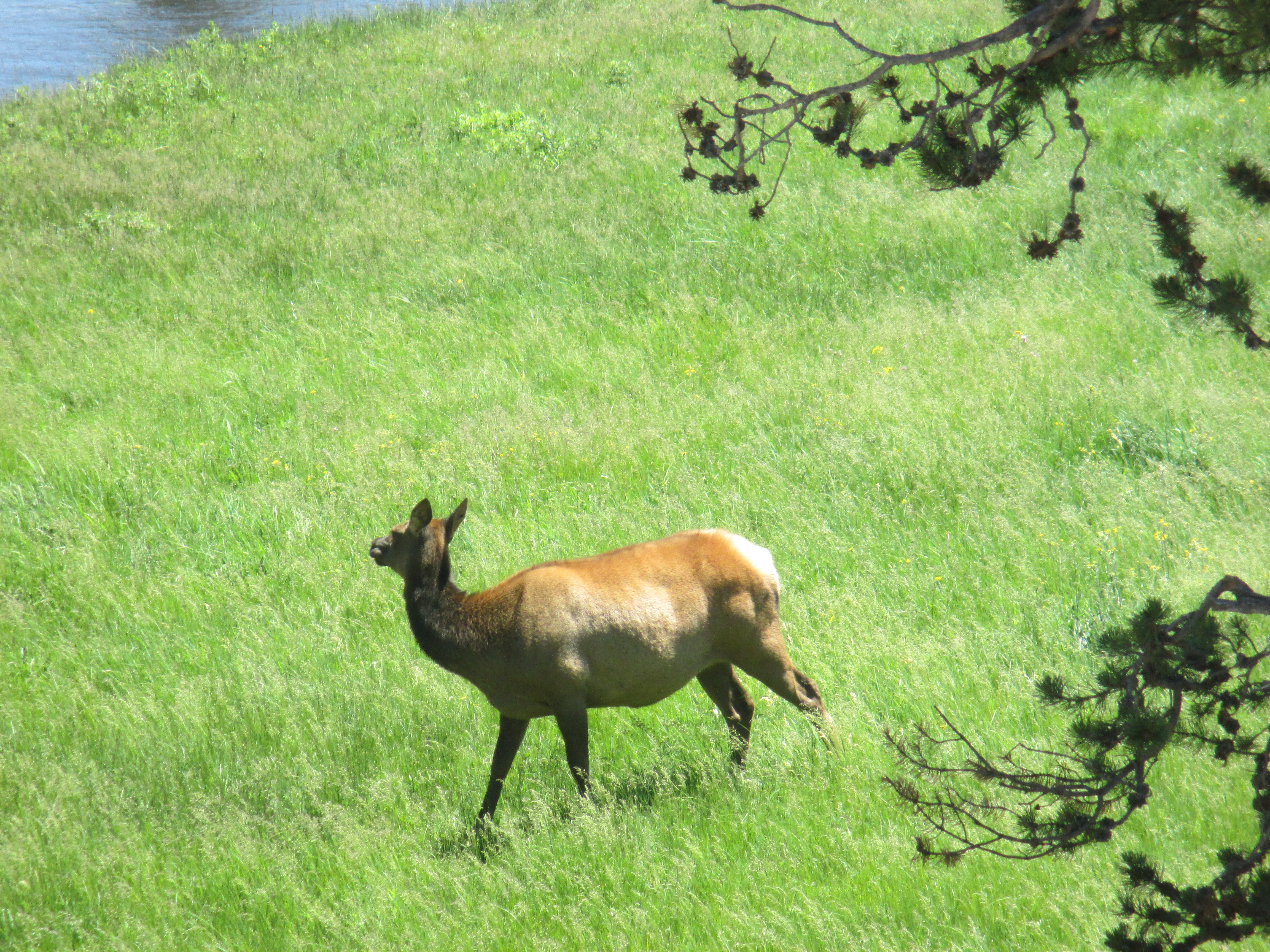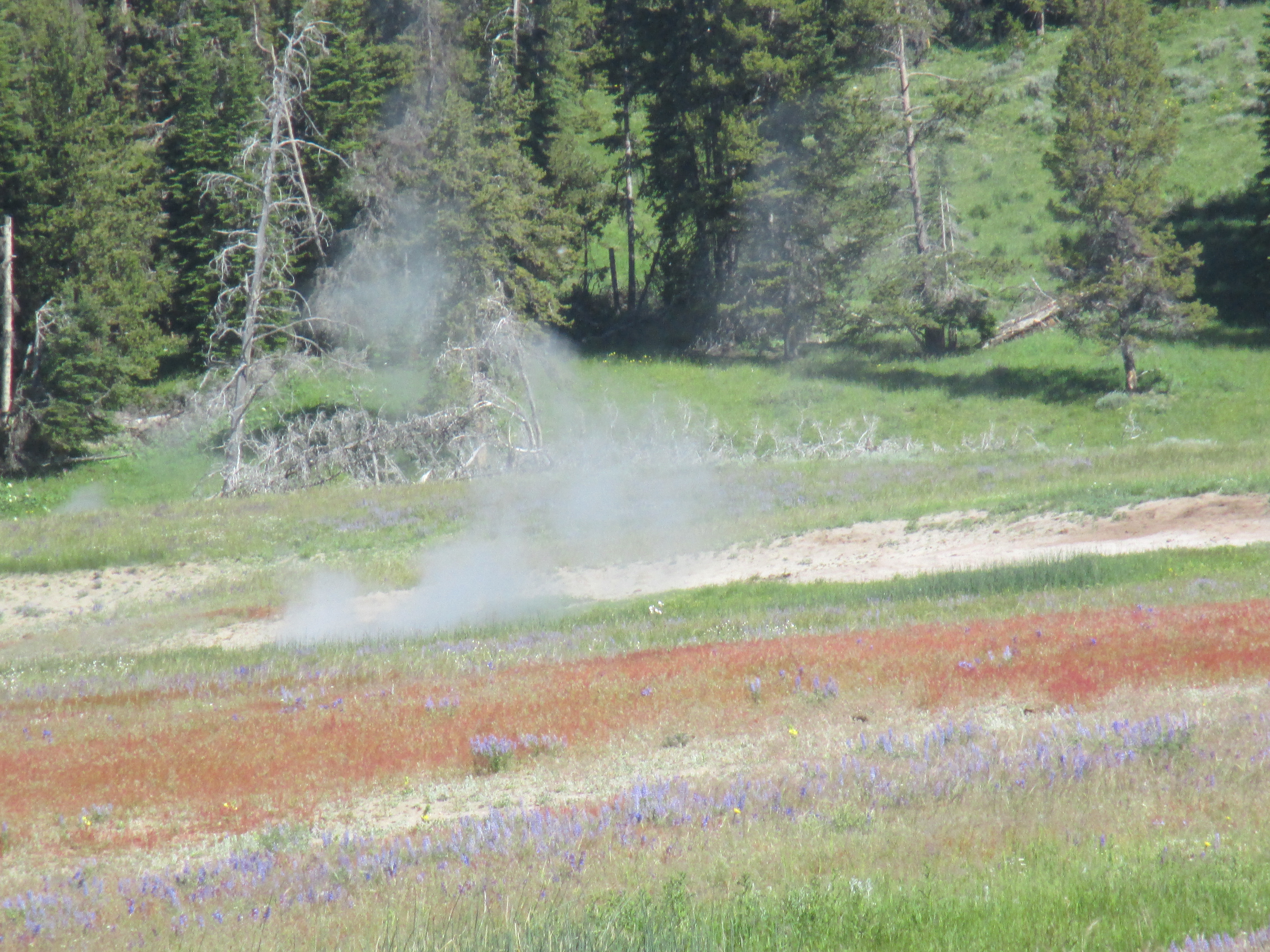 Welcome to Yellowstone Park!Old Faithful Lodge in Yellowstone Park – great ice cream store in this location…then again every ice cream store is great!The Ol’ Girl blowing off her steam!Geothermal activity can be found throughout the park with many geysers in the basinA meadow in Yellowstone filled with wildflowersA field of dreams!The wildlife was plentiful in Yellowstone Park. Here is a young elk enjoying its mid day snack